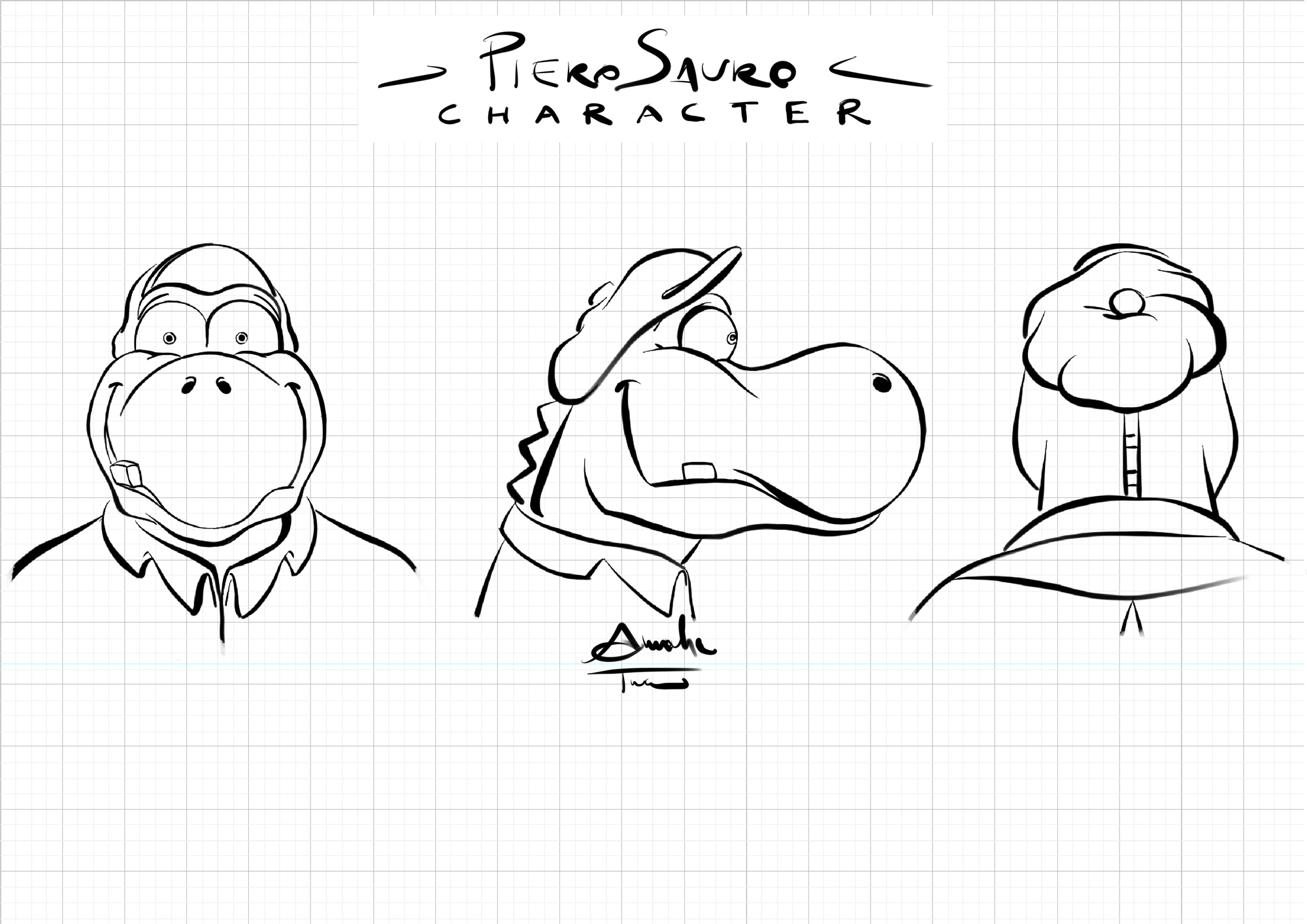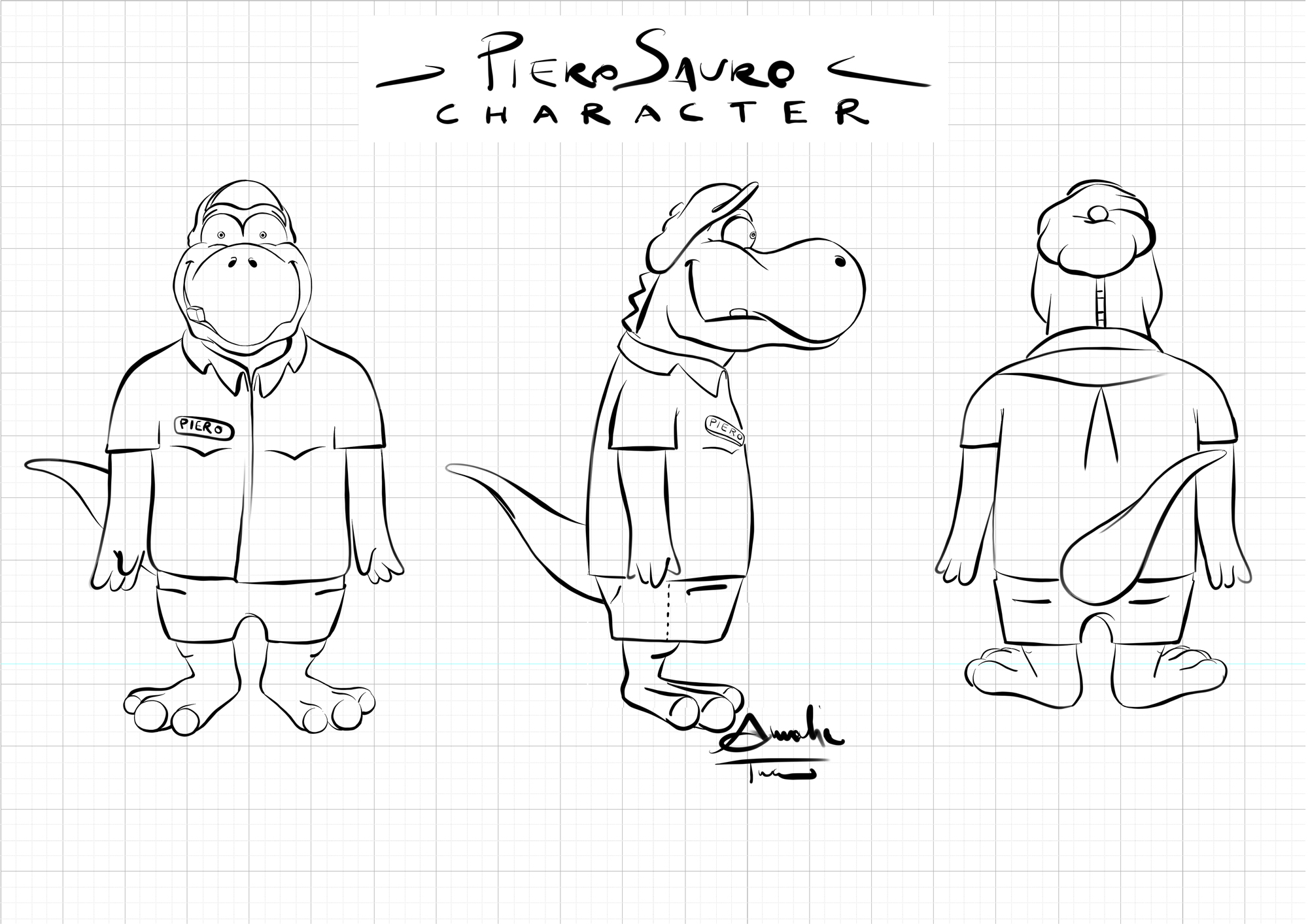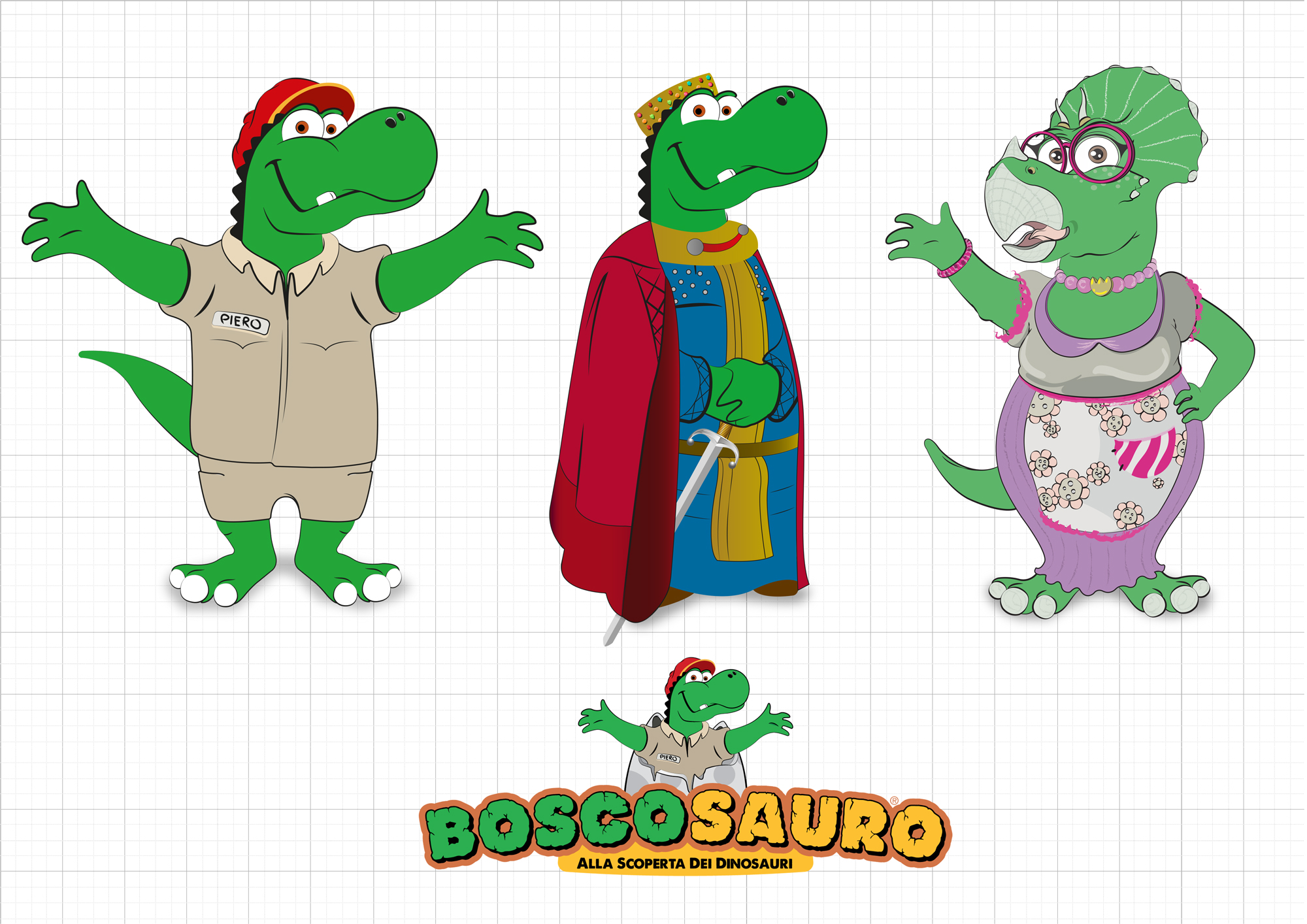 In questo caso vediamo Pierosauro, il character che abbiamo realizzato per Tenuta Sabini – Boscosauro, un dinosauro umanizzato, dal carattere dolce e protettivo, vestito come le guide del Boscosauro.